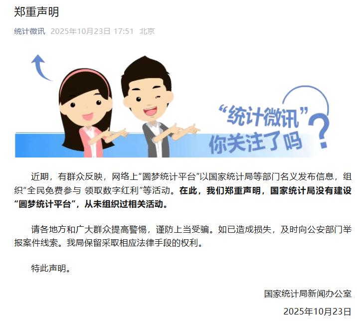 声明称,近期,有群众反映,网络上“圆梦统计平台”以国家统计局等部门名义发布信息,组织“全民免费参与 领取数字红利”等活动。在此,郑重声明,国家统计局没有建设“圆梦统计平台”,从未组织过相关活动。
