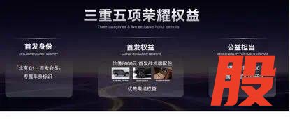 1.专属首发身份权益盲订且最终购车的用户,将获授「北京81・首发会员」荣誉身份,并授予线上勋章和实体徽章。首发车型将在车身多处,镌刻首发车印记,打造专属身份标识。