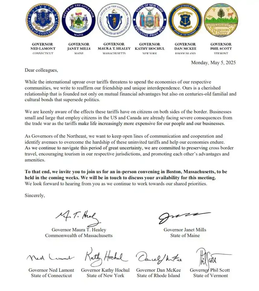 当地时间5月5日,美国东北部马萨诸塞州、缅因州、纽约州、康涅狄格州、罗得岛州、佛蒙特州这六个州的州长向加拿大六个省的省长发出邀请,拟在波士顿举行会谈,讨论“美国关税政策的影响,以及美国和加拿大如何继续合作维持强劲的贸易关系”。